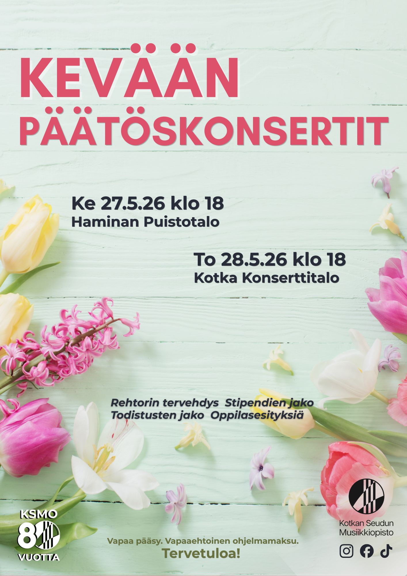 Lämpimästi tervetuloa musiikkiopiston kevään päätöskonsertteihin Haminaan ja Kotkaan. Rehtorin tervehdys, stipendien ja todistusten jako, oppilaiden musiikkiesityksiä. Tule kanssamme toivottamaan hyvää kesää!