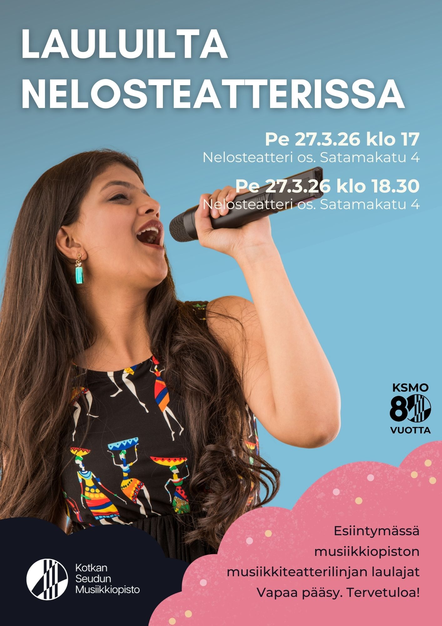 Tervetuloa Nelosteatterin lauluiltaan, jossa esiintyvät musiikkiopiston musiikkiteatterilinjan laulajat kahtena eri kellonaikana. Vapaa pääsy!
