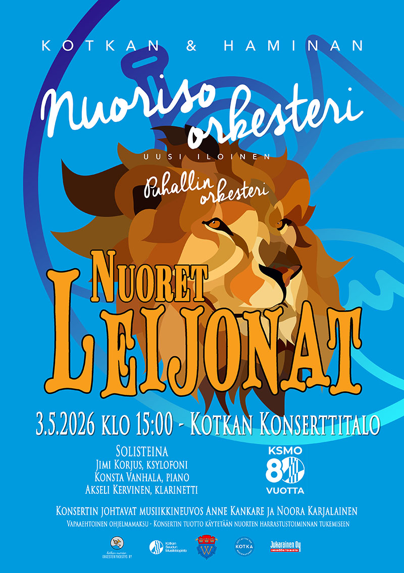 Nuoret Leijonat -konsertissa esiintyvät Kotkan & Haminan Nuoriso-orkesterit sekä Uusi iloinen puhallinorkesteri. Solisteina: Jimi Korjus, ksylofoni, Konsta Vanhala, piano ja Akseli Kervinen, klarinetti. Konsertin johtavat Musiikkineuvos Anne Kankare ja Noora Karjalainen. Vapaa pääsy. Vapaaehtoinen ohjelmamaksu nuorten harrastustoiminnan tukemiseksi. Lämpimästi tervetuloa!