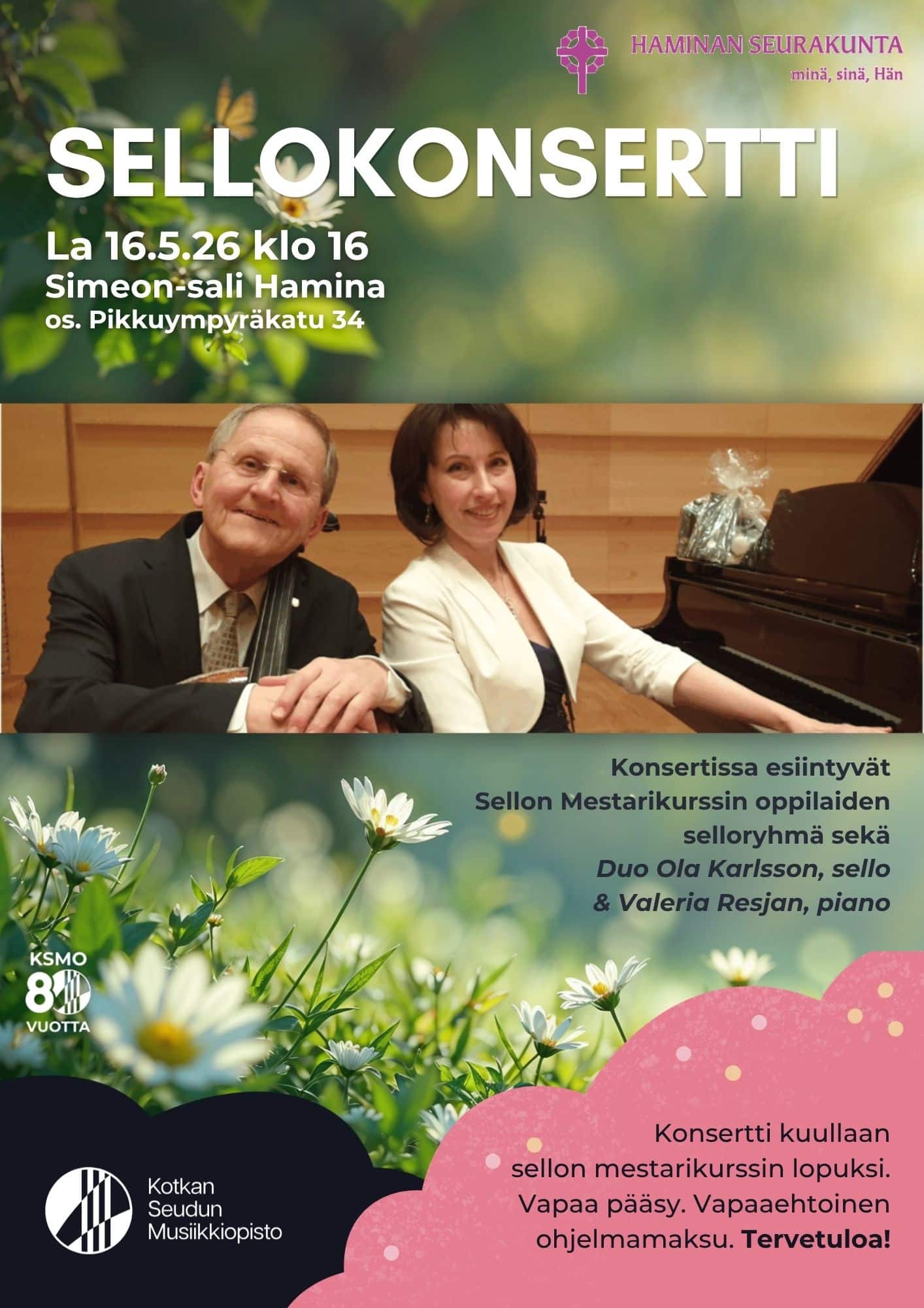 Tervetuloa Sellokonserttiin Haminaan! Esiintymässä musiikkiopiston sellon mestarikurssin selloryhmä ja Duo Ola Karlsson, sello & Valeria Resjan, piano. Vapaa pääsy, vapaaehtoinen ohjelmamaksu.